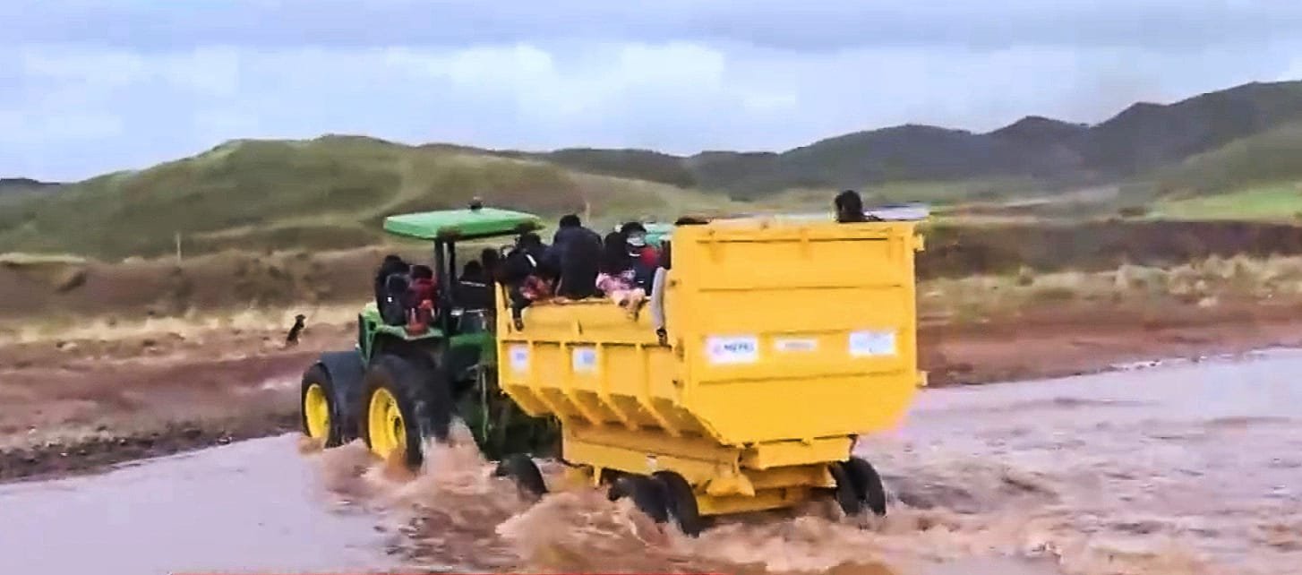 Comunarios de Villa Santiago de Chacoma en la población Viacha del departamento de la paz, se encuentran indignados, tras presenciar a niños siendo trasladados en un tractor a sus unidades educativas, a través de un rio con aguas caudalosas, solicitando la construcción de un puente.
