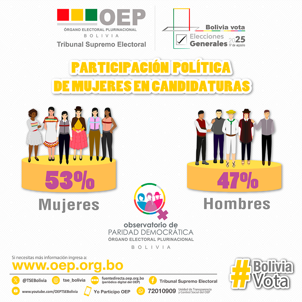 Bolivia da un paso significativo hacia la equidad de género en la política: la participación de mujeres en las candidaturas titulares para las Elecciones Generales 2025 alcanzó el 53 %, superando por primera vez el porcentaje de candidatos hombres, quienes representan el 47 %, según el Observatorio de Paridad Democrática del Tribunal Supremo Electoral (TSE).