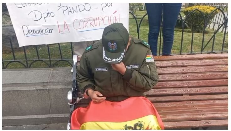 El suboficial con manillas y atado a la banca del sector, se declara en huelga de hambre con un cartel de fondo donde se percibe su protesta sobre su cambio de destino al departamento de Pando, después de revelar aparentes actos de corrupción en instituciones en las que él trabajaba.