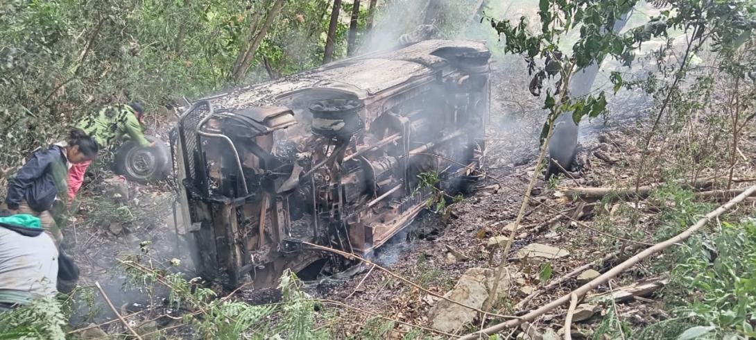 Un minibús se embarrancó e incendió tras un deslizamiento de rocas, en la carretera antigua Santa Cruz-Cochabamba, por inmediaciones del puente de Petacas, en el municipio de Samaipata, las mismas que cayeron sobre el vehículo y provocaron que el conductor salga de la vía.