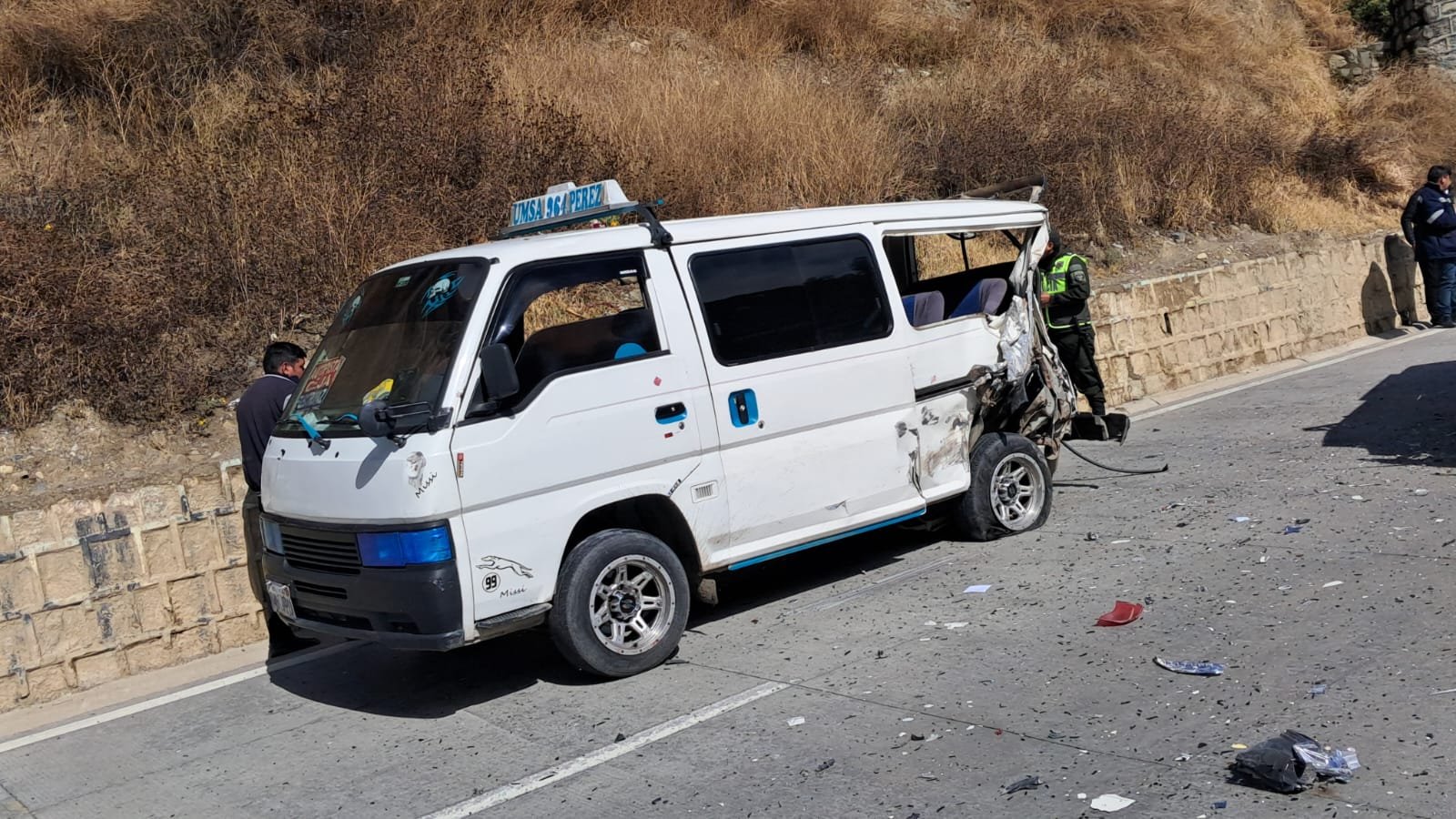“Se habría producido un accidente, un choque de dos minibuses una colisión la cual tiene como resultado dos personas mayores heridas y la y una menor, hija de uno de ellas, de estas personas uno de 30, la de 32 años han sido trasladada a una clínica” informó el Cnl. Pavel Tovar, Director Departamental de bomberos.