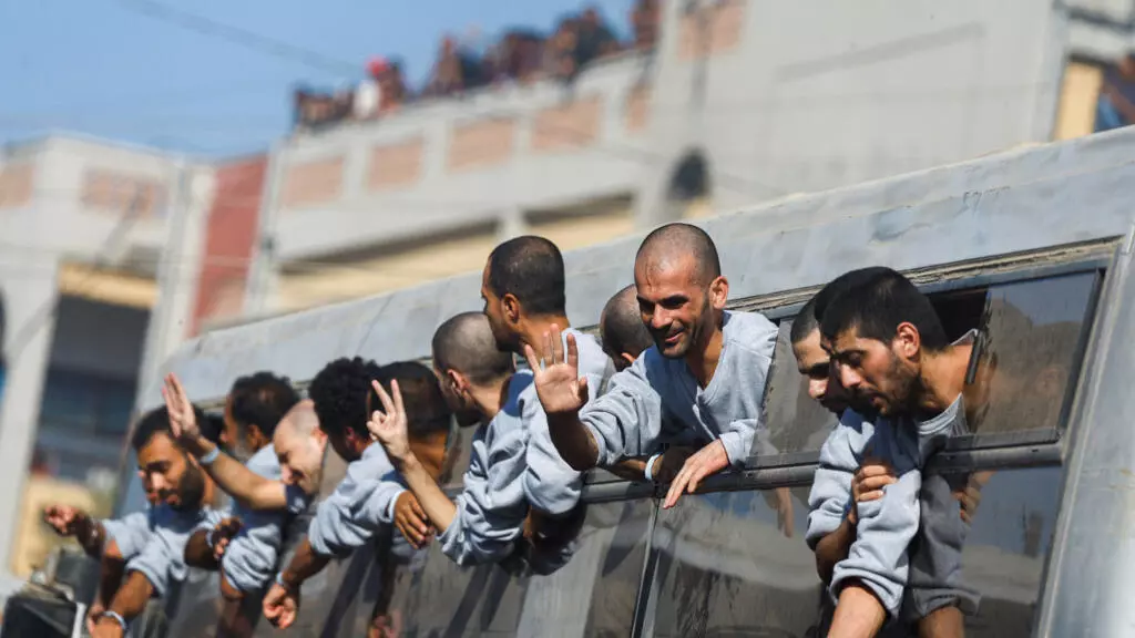 Prisioneros palestinos liberados hacen un gesto desde un autobús tras ser liberados por Israel como parte de un intercambio de rehenes y prisioneros / Reuters