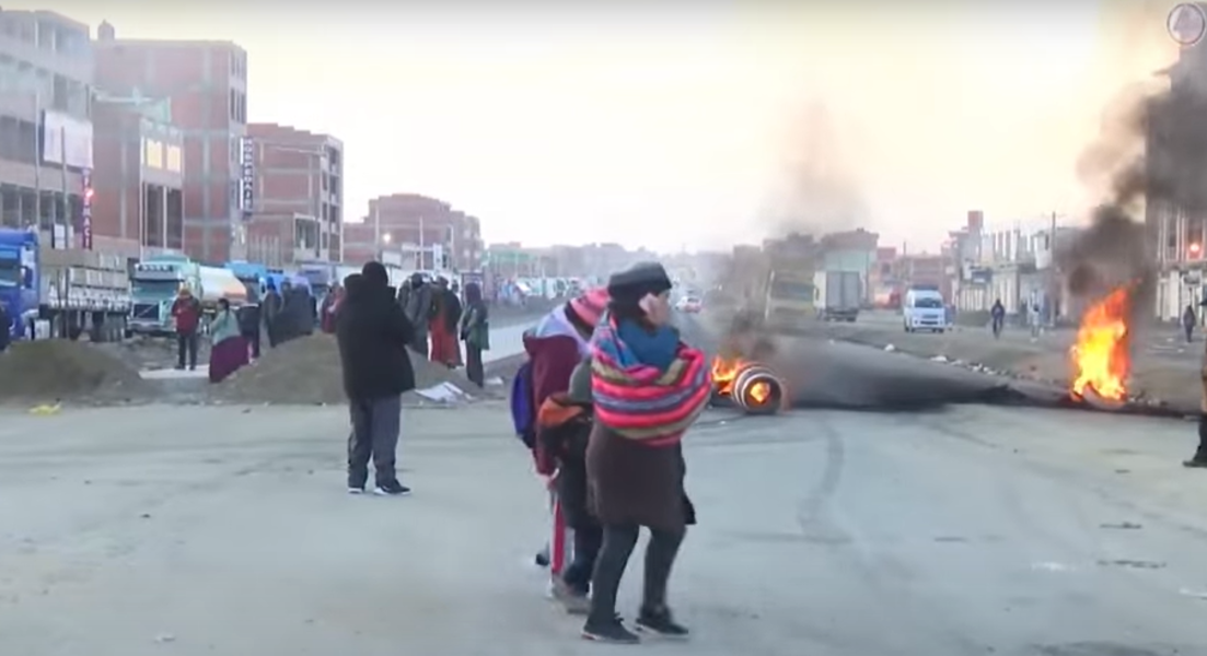 Vecinos del Distrito 8 de la ciudad de El Alto instalaron un punto de bloqueo a la altura del cruce a Layuri, en la carretera a Oruro, en rechazo al incremento de los pasajes del transporte público y el encarecimiento de productos básicos de la canasta familiar.