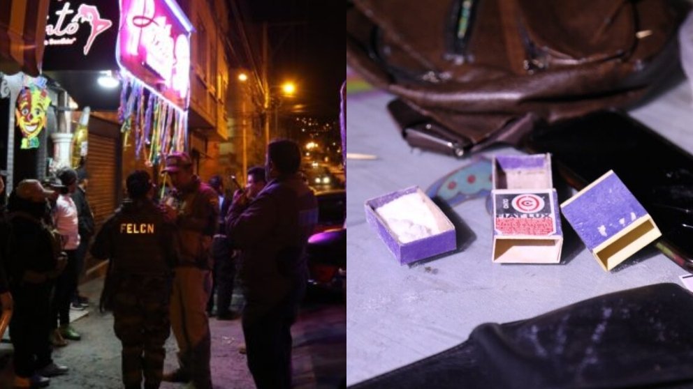 “Se hizo una revisión del lugar y en el interior del baño se ha encontrado una bolsa plástica que contenía una sustancia de color blanquecina, con color y características de droga”, informó el jefe de la División Trata y Tráfico de Personas de la Fuerza Especial de Lucha Contra el Crimen (FELCC), William Calderón.