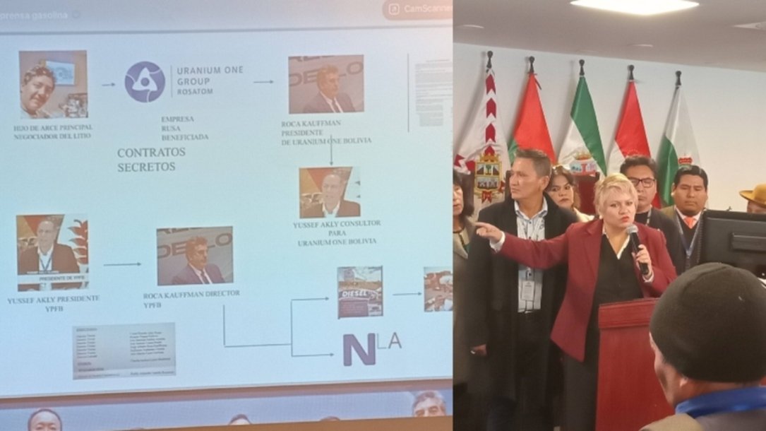 Según el informe, la estructura de corrupción estaría integrada por Marcelo Arce Mosqueira, hijo del expresidente Arce, quien sería el “gran negociador del litito” y Jorge Alberto Roca Kauffman, expresidente de Lithium One Bolivia, filial de Uranium One Rusia, y actual director de YPFB. Este último también es socio de la empresa privada Energy Oil Corporation PM SRL, encargada del transporte de combustible.