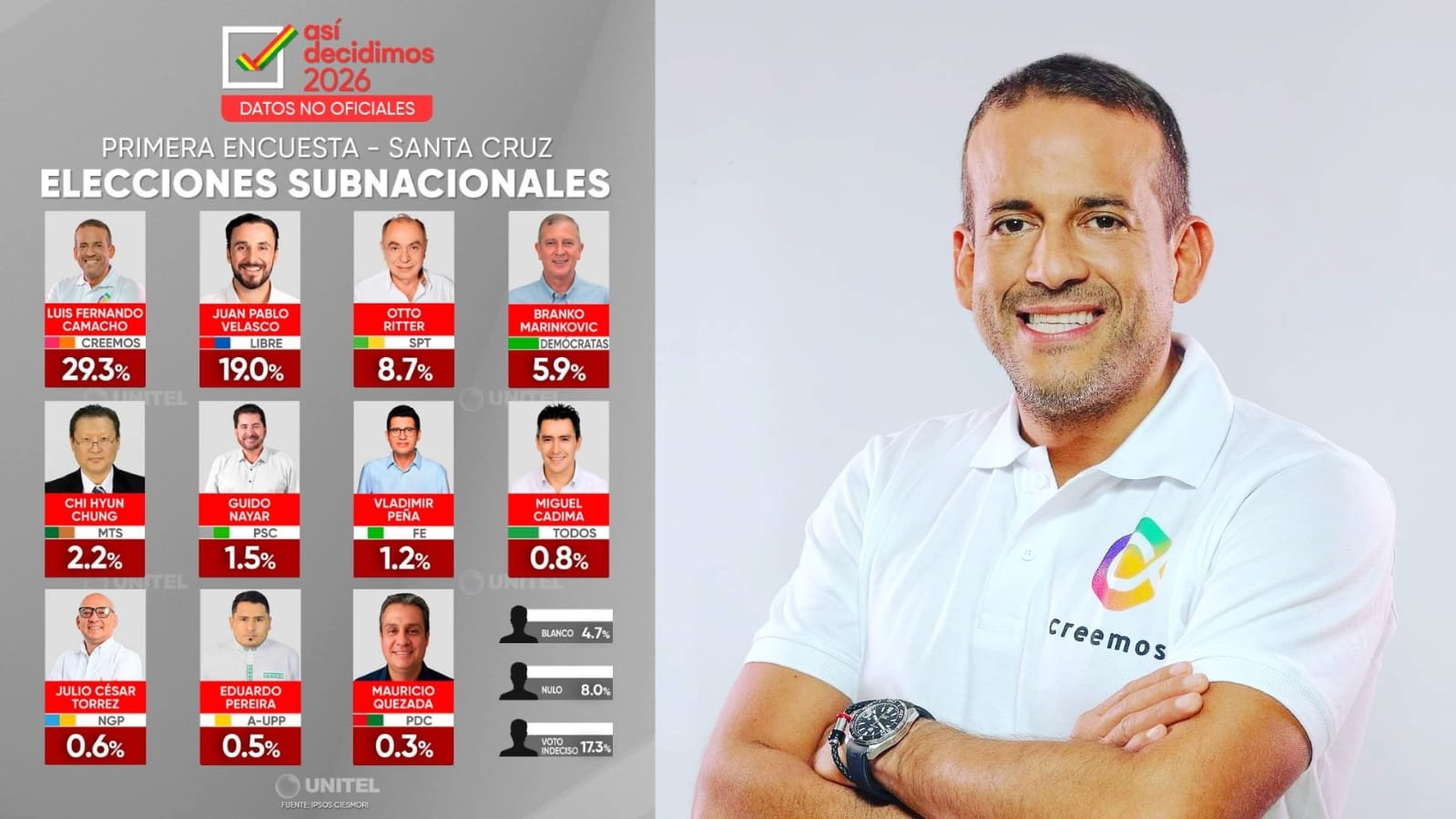 Le siguen Juan Pablo Velasco, de Libre, con un 19%, y Otto Ritter, de Santa Cruz para Todos, con un 8,7%. La encuesta también muestra que un 17,3% de los encuestados se mantiene indeciso, un 8% optaría por votar nulo y un 4,7% por blanco. Estos resultados reflejan la competencia electoral en Santa Cruz de cara a las elecciones del 22 de marzo.