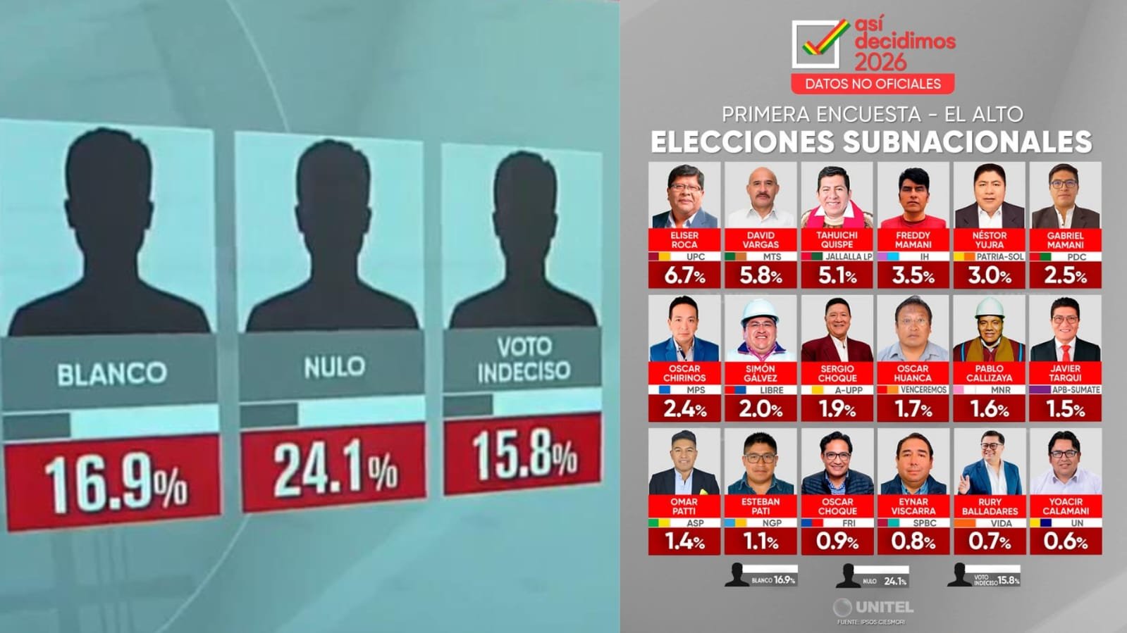 La ciudad de El Alto se encuentra en un escenario electoral incierto, según la primera encuesta de intención de voto presentada por UNITEL este jueves. El estudio, realizado por Ipsos CIESMORI, revela que ninguno de los candidatos a la Alcaldía alcanza un porcentaje superior al 7%, mientras que las cifras más altas se las llevan los votos nulo, blanco o indeciso.