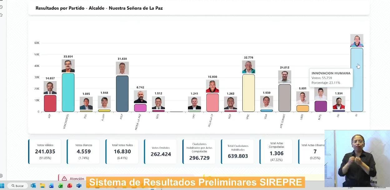 Dockweiler lidera primer lugar en la Alcaldía de La Paz con casi el 47% de actas computadas