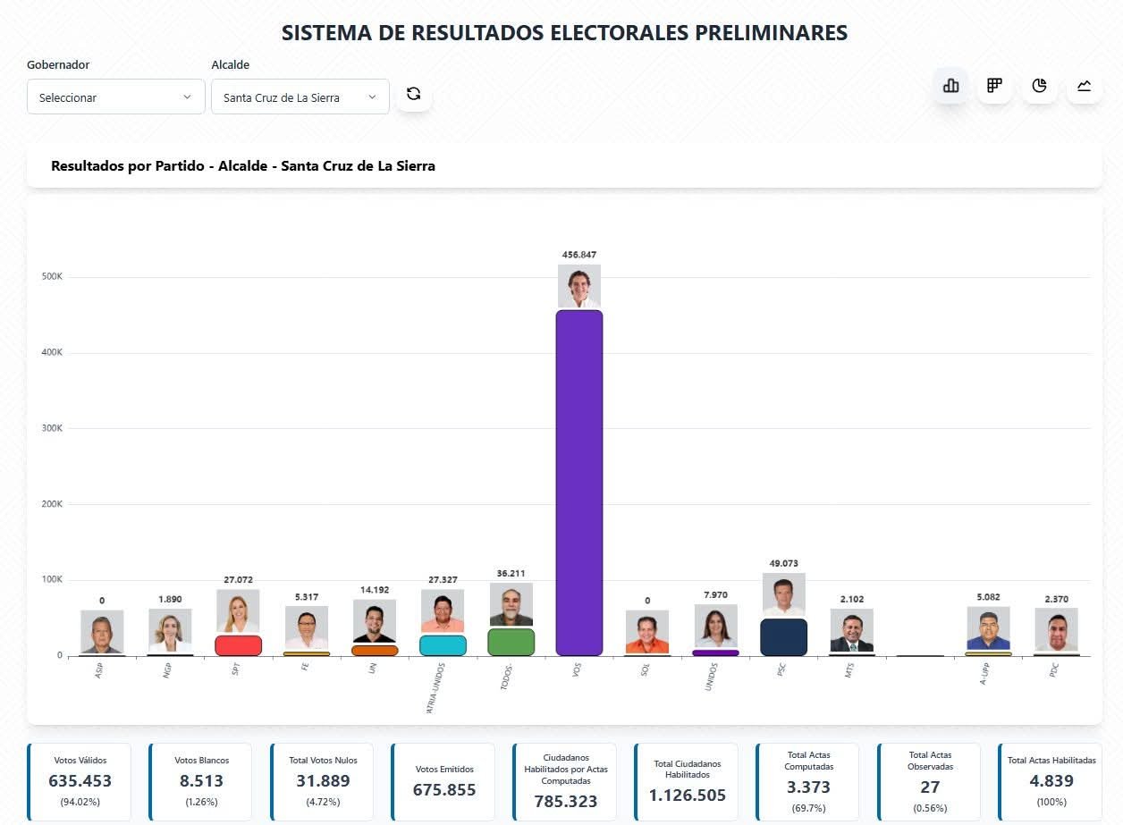 El sistema preliminar Sirepre ya refleja la victoria de Saavedra, pero el Tribunal Electoral Departamental continúa con el cómputo oficial de actas en Sala Plena para confirmar los resultados finales.