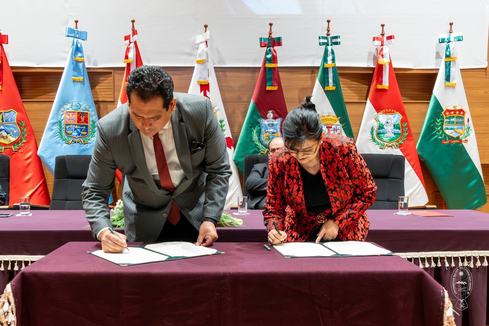 El presidente de la Cámara de Diputados de Bolivia, Roberto Castro, y la rectora de la Universidad Mayor de San Andrés (UMSA), María Eugenia García, firmaron este martes dos convenios marco de cooperación interinstitucional que tienen el objetivo de promover proyectos, investigaciones, pasantías y trabajos dirigidos en el ámbito legislativo.