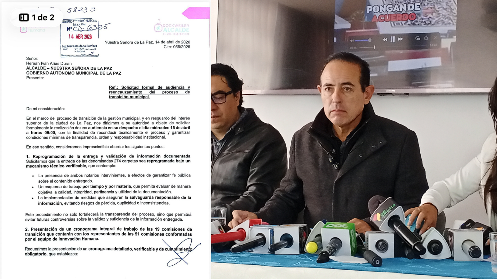 César Dockweiler, líder de Innovación Humana, solicitó una reunión con el alcalde Iván Arias, para este miércoles 15 de abril a las 09:00 en su despacho. El encuentro busca resolver los recientes desacuerdos en el traspaso administrativo y reencaminar el proceso de transición. La propuesta plantea establecer un nuevo calendario de trabajo que garantice a la ciudad orden, transparencia y responsabilidad institucional.