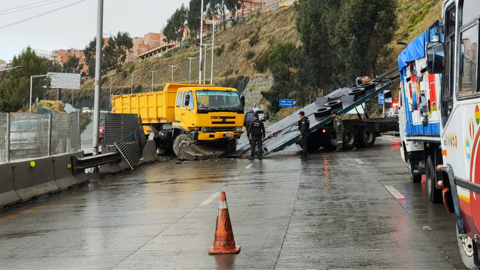 Una volqueta colisionó contra un minibús y luego impactó contra el separador vial de la autopista La Paz – El Alto. El hecho se registró a la altura del peaje, en el carril de bajada hacia la ciudad de La Paz.